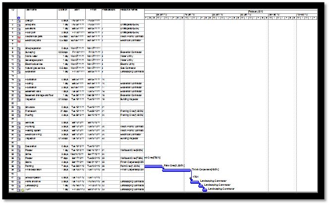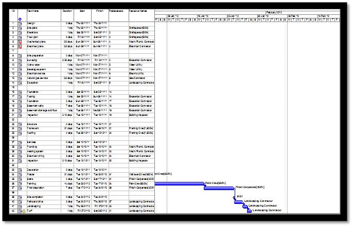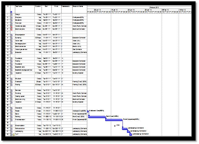 Q.5 There has been a change in the project plan. You will now only have a framing crew of 12 persons working on the structural phase. Make the necessary changes to the resource allocations. Notice any changes in task durations, as well as any change to the project finish date. (Suggestion: based on the latest project plan, make this change and save as a different file.)By reducing the number of framing crew workers from 16 to 12, the number of days for the Roofing task increase from 4 to 5.33 and Framework increases from 21 to 28 days but the because of overlapping of task to each other work duration of over tasks of Plumbing, Heating system and Electrical wiring to some extent and number of total days increase is 3. The project completion date extends from 21/01/12to 24/01/12 after the number of workers for painting were increased.